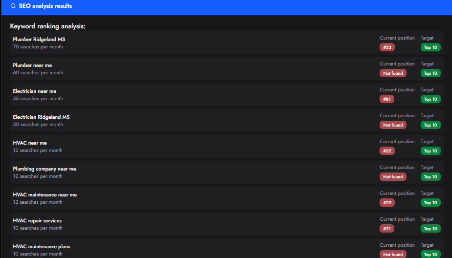 This section shows your current position for important service-related keywords.