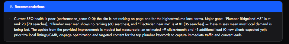 This section highlights the main actions needed to improve rankings, such as optimizing website content, improving local listings, and targeting high-value keywords.