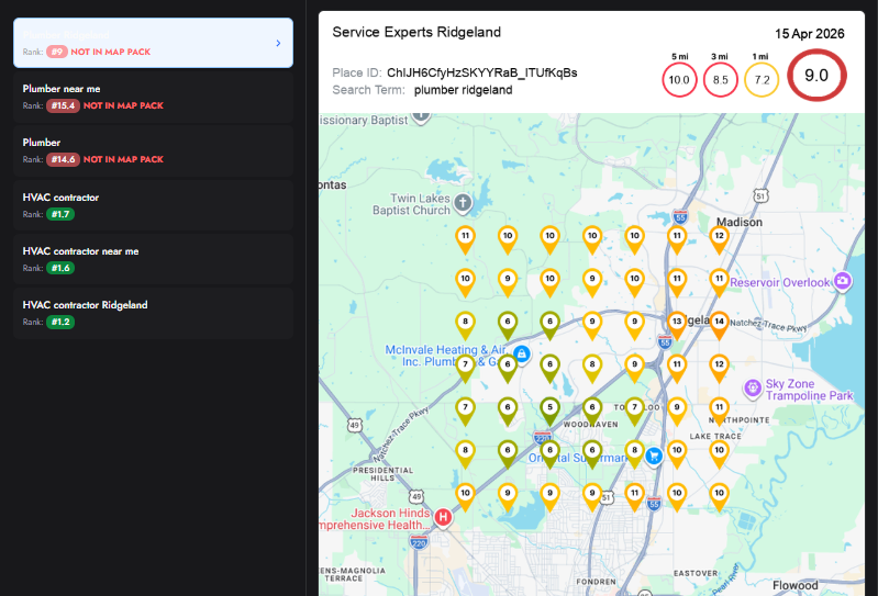 The grid represents your rankings across a geographic area around your business.