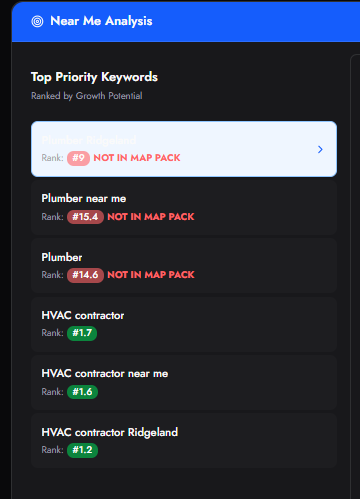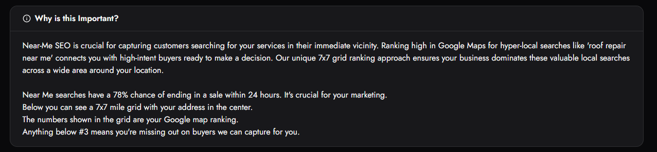 The Near Me SEO product is designed to solve your gaps in local map visibility and geographic coverage.