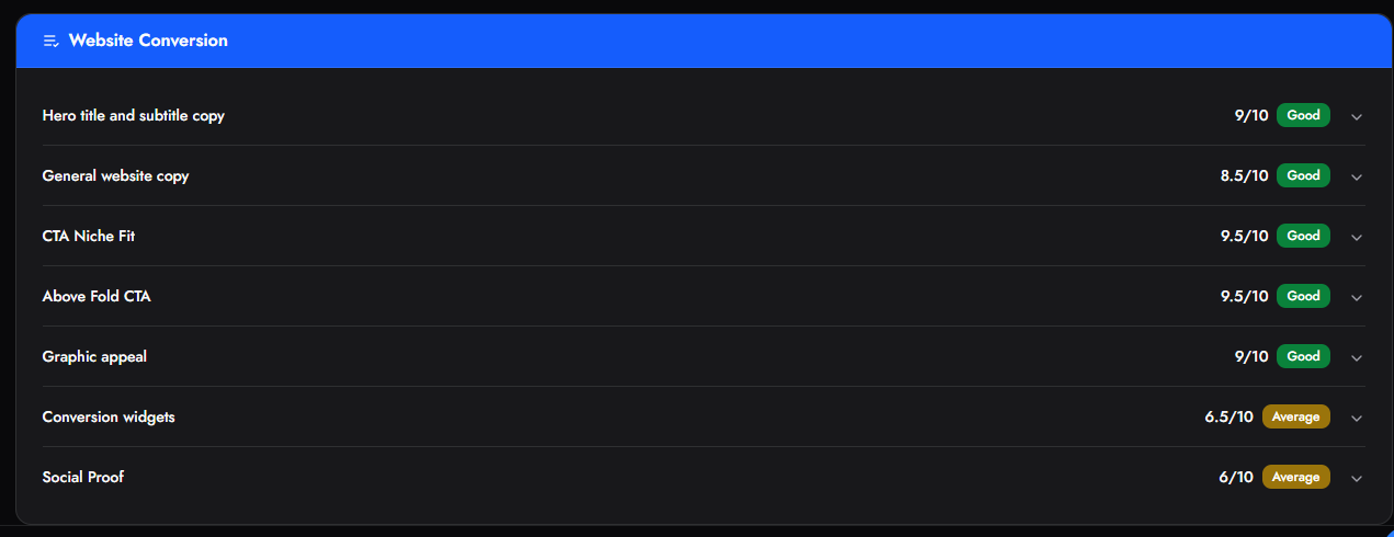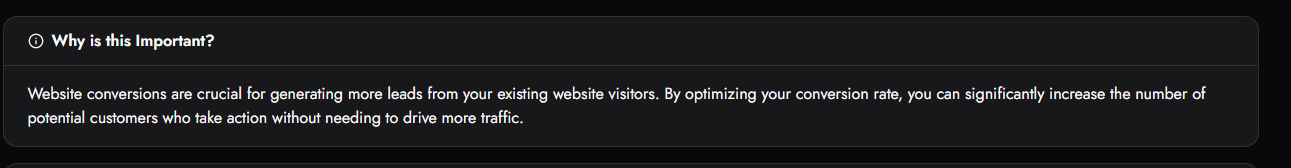 The Website Conversion section evaluates how effectively your website experience turns visitors into leads. Rather than looking at how many people visit your site, this analysis looks at what happens once they arrive. It identifies growth opportunities by assessing high-level factors like messaging clarity, trust signals, and user flow to ensure your site is designed to guide visitors toward contacting you.