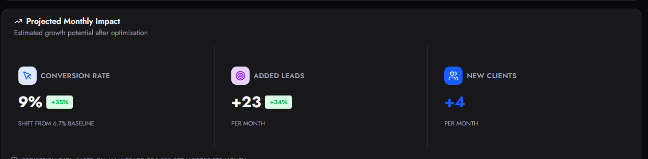 Added Leads: This is the estimated number of extra leads your website could generate if your conversion rate improves from its current level to a fully optimized level. It highlights the lead opportunity you are currently missing.