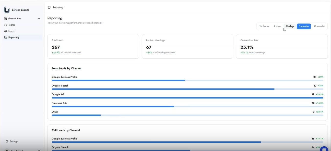 The Reporting dashboard updates in real time. Data appears as soon as leads are captured and activity is recorded across your active channels.