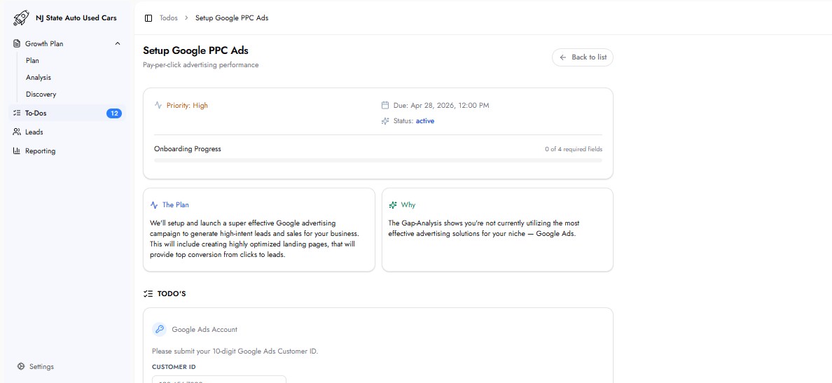 If you do not have a Google Ads account, the To-Do includes a direct 'Click here to create one' link. Creating an account is free and the Customer ID is available immediately after account creation.