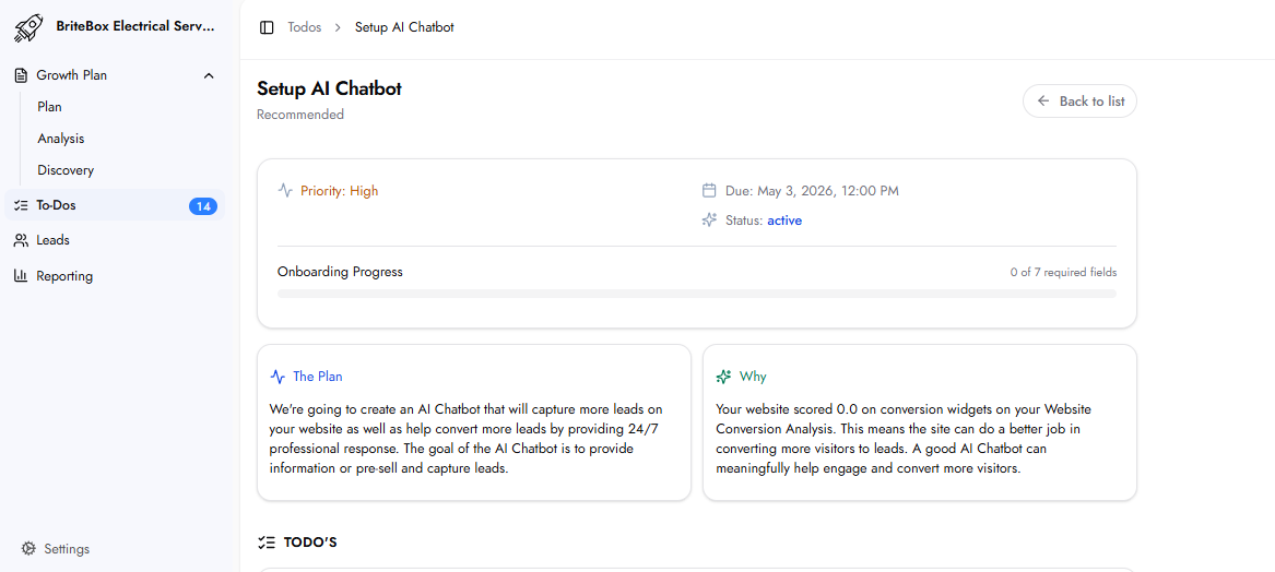 This task creates an AI Chatbot that will be installed on your website to capture more leads and help convert more visitors by providing 24/7 professional responses. The goal of the AI Chatbot is to provide information, pre-sell your services, and capture leads from visitors who may not be ready to call.