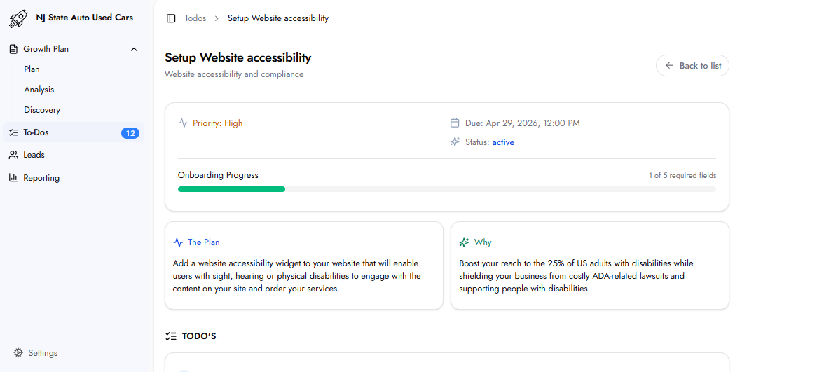 25% of US adults live with some form of disability — sight, hearing, or physical limitations that affect how they browse websites. A website without accessibility features excludes this segment of potential customers entirely. Beyond the audience opportunity, businesses with accessibility issues on their website face real legal exposure under ADA compliance requirements. The Website Accessibility Analysis section identifies the specific active issues on your site. The widget directly addresses these gaps.