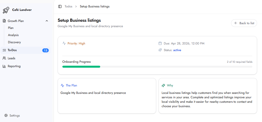 This task enables the platform to create, claim, and optimize your business listings across major online directories and local search platforms, with Google Business Profile as the primary focus.