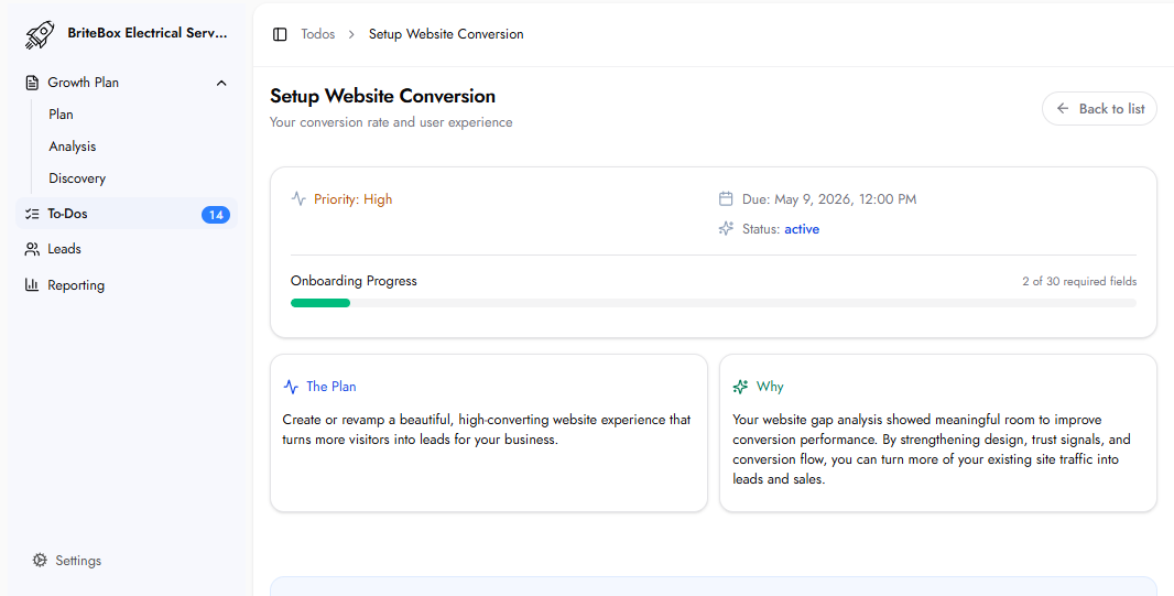 This To-Do contains 30 required fields covering detailed business and website information needed to optimize your conversion experience. Many are pre-filled from existing data.