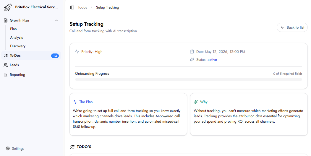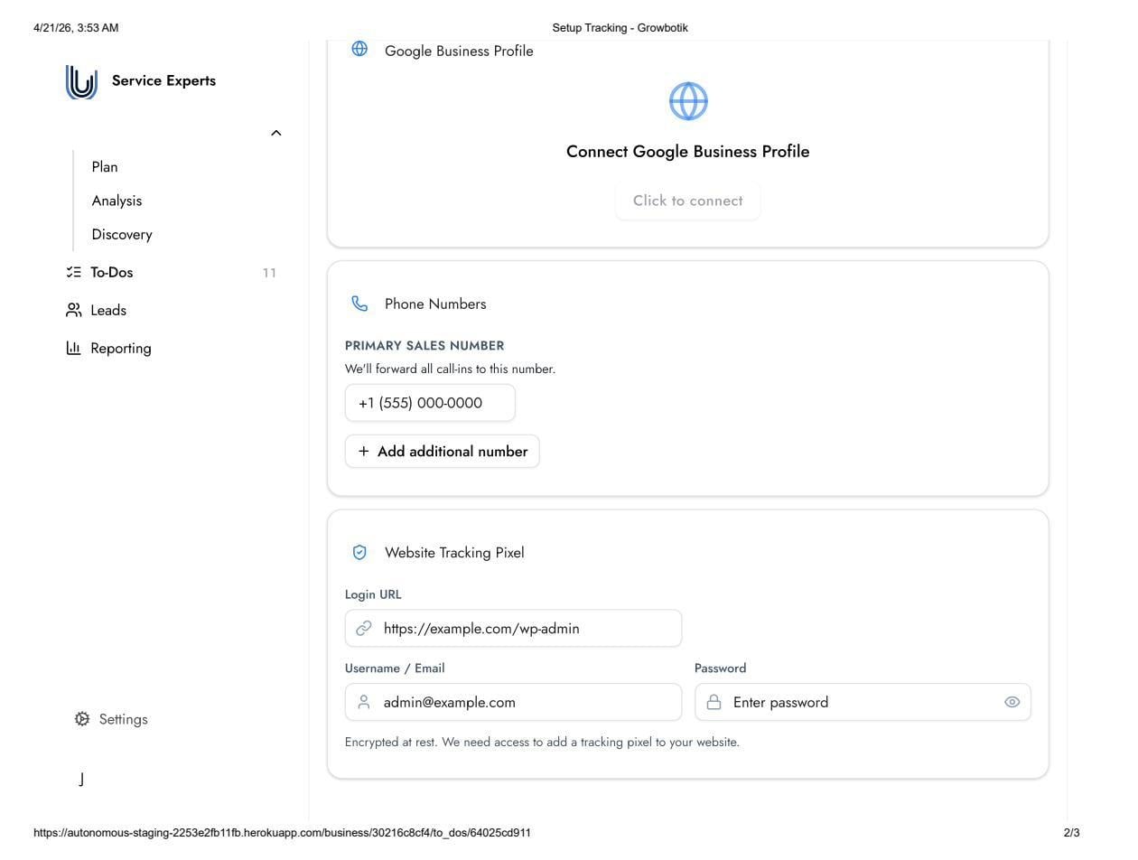 Connect Google Business Profile: A 'Click to connect' button that links your Google Business Profile to the the platform tracking system directly inside this To-Do.