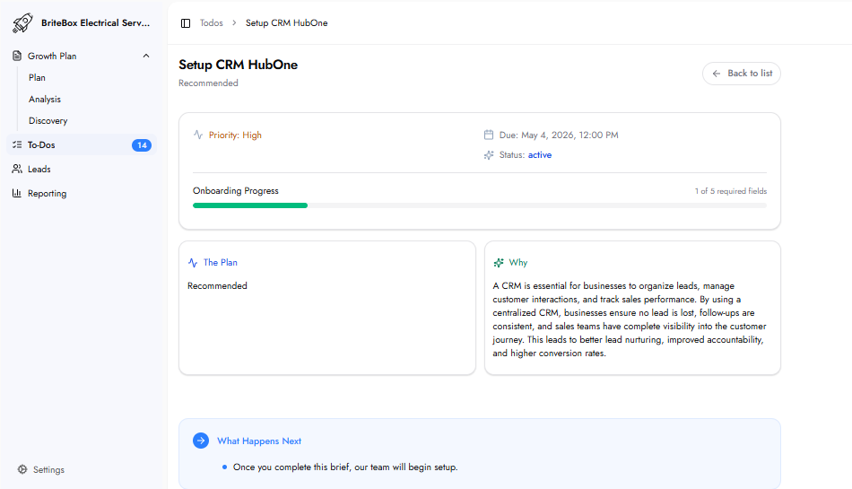 HubOne is recommended for businesses that do not currently have a CRM. If your business already has an existing CRM, the team will integrate with it through the Setup Automated CRM Workflows To-Do instead — HubOne would not typically appear in your To-Do list in that case.